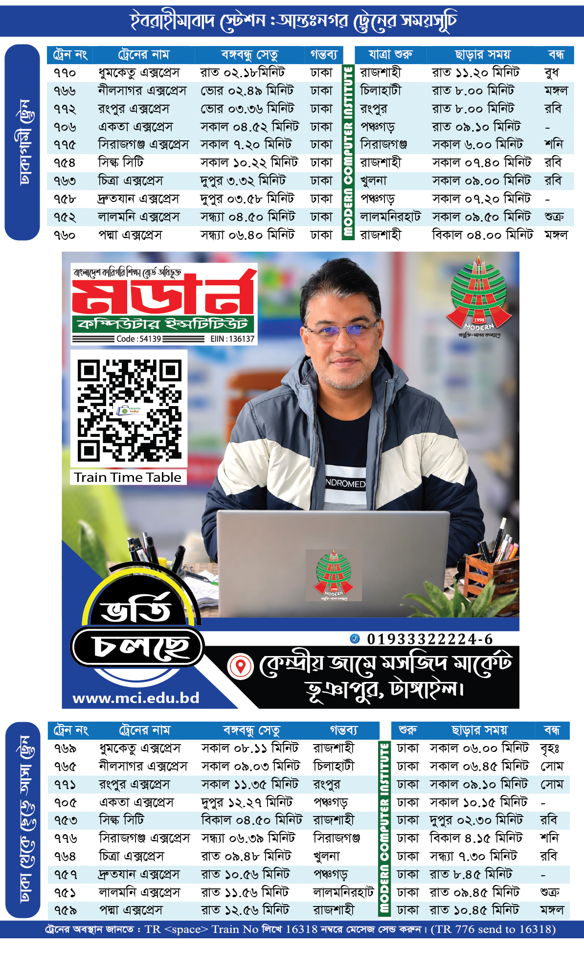 | 776 | Sirajganj Express | 07:20 AM | Sirajganj | Dhaka | 04:15 PM | Saturday |